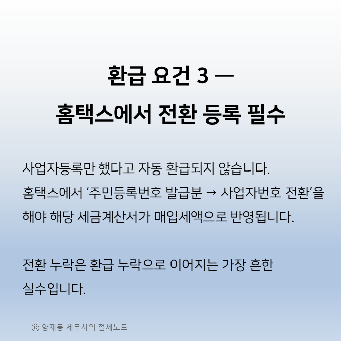 💬 실무에서는 “세금계산서는 있는데 전환이 안 돼 환급 불가” 사례가 매우 많습니다.