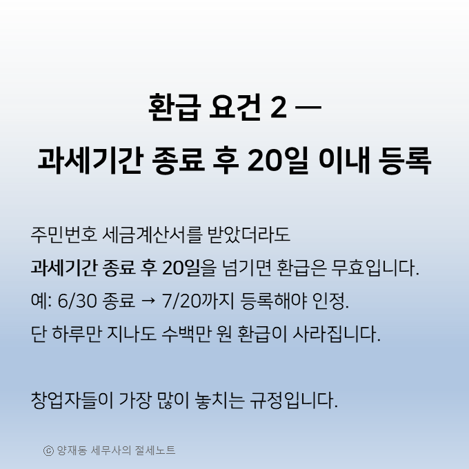 과세기간 종료 후 20일 이내에 사업자등록을 하지 않으면 환급이 불가능합니다.