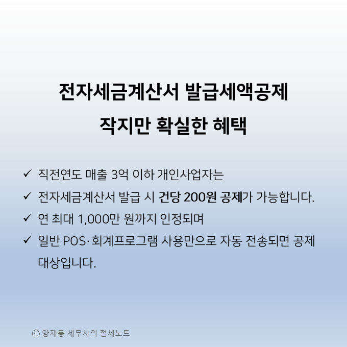 직전연도 매출이 3억 원 이하라면, 전자세금계산서를 발급할 때마다 건당 200원씩 공제됩니다.