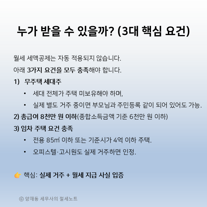 주택은 전용면적 85㎡ 이하 또는 기준시가 4억 원 이하여야 하며, 오피스텔·고시원·반지하라도 실제 거주 중이면 인정됩니다. 결국 핵심은 “실제 거주 중인 주택에 월세를 지급했는가” 입니다.