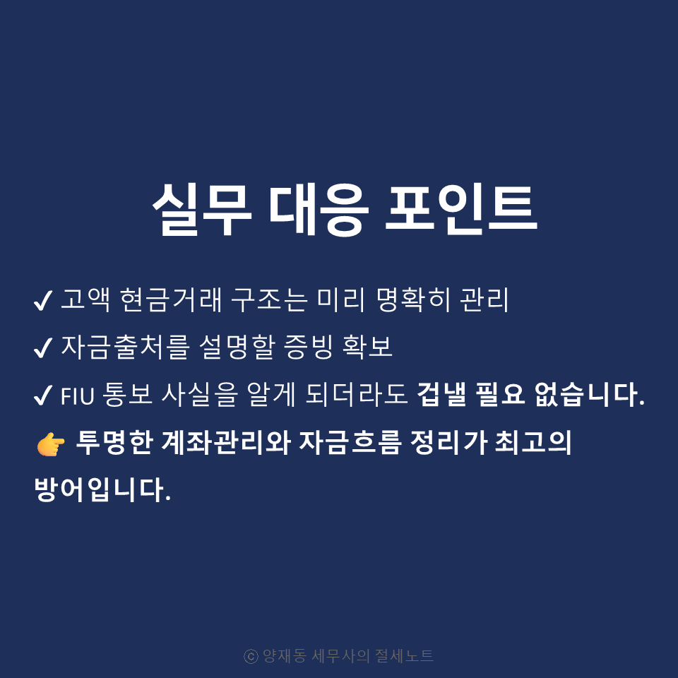 즉, FIU 통보는 세무조사의 “시작”이 아니라, 데이터 상의 이상 신호를 알리는 경고등입니다.