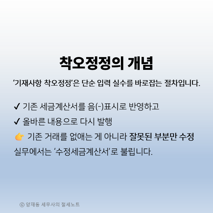 세법에서 말하는 착오정정은 “거래 사실은 맞는데, 표시된 정보에 오류가 있는 경우”를 의미합니다.