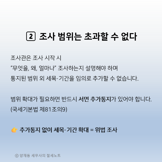 2️⃣ 조사 목적·세목·범위를 설명받을 권리(범위 초과 금지)