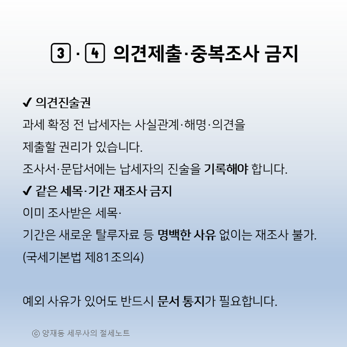 4️⃣ 같은 세목·과세기간에 대한 재조사를 받지 않을 권리(중복조사 금지)