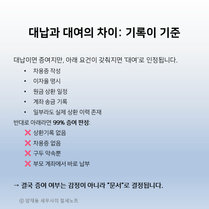 가장 큰 차이는 기록입니다. 차용증 한 장, 계좌이체 한 줄이 수천만 원의 증여세를 막아줍니다.