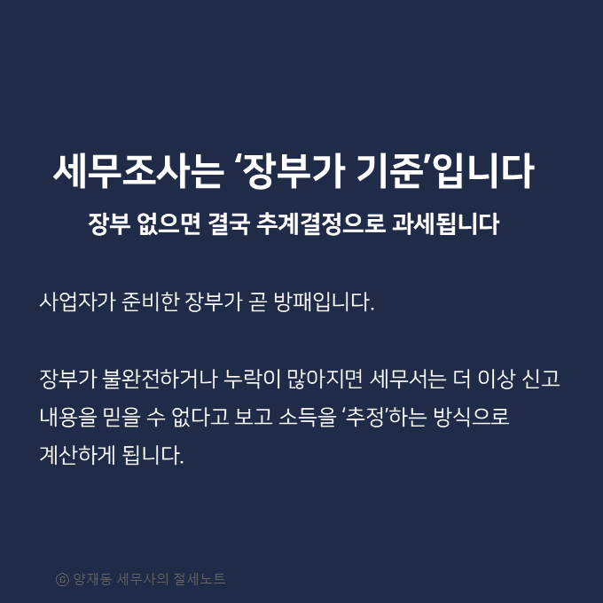 장부는 단순한 회계기록이 아니라, 과세관청의 계산에 대응할 수 있는 납세자의 증거이자 방어수단입니다.