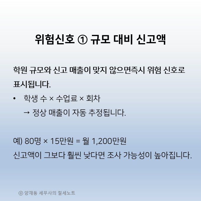교육업 세무조사는 단순히 매출 누락 여부가 아니라 학원 규모·학생 수·수업 횟수를 기반으로 ‘정상 매출’을 역산하는 구조로 운영됩니다.