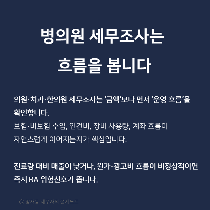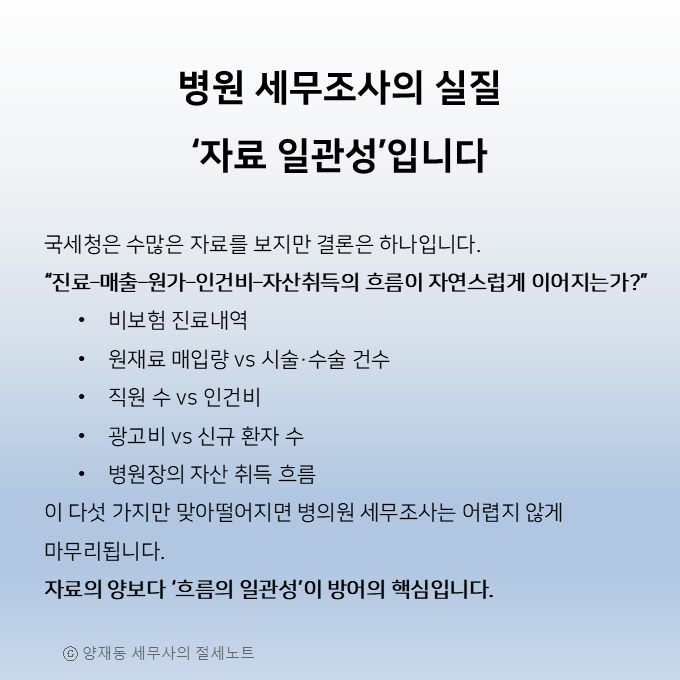 6️⃣ 마무리 ― 병의원 세무조사의 본질은 “일관성 검증”입니다