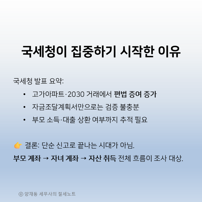 이에 따라 단순히 자녀의 자금만 확인하는 수준을 넘어, 그 자금의 실제 출처(부모의 자금 흐름)까지 추적하겠다는 입장입니다.
