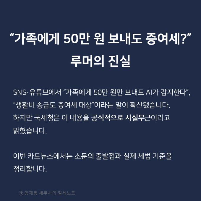 결국 “가족에게 50만 원만 보내도 증여세 폭탄”이라는 말은 근거 없는 ‘AI 세무조사 괴담’에 불과합니다.