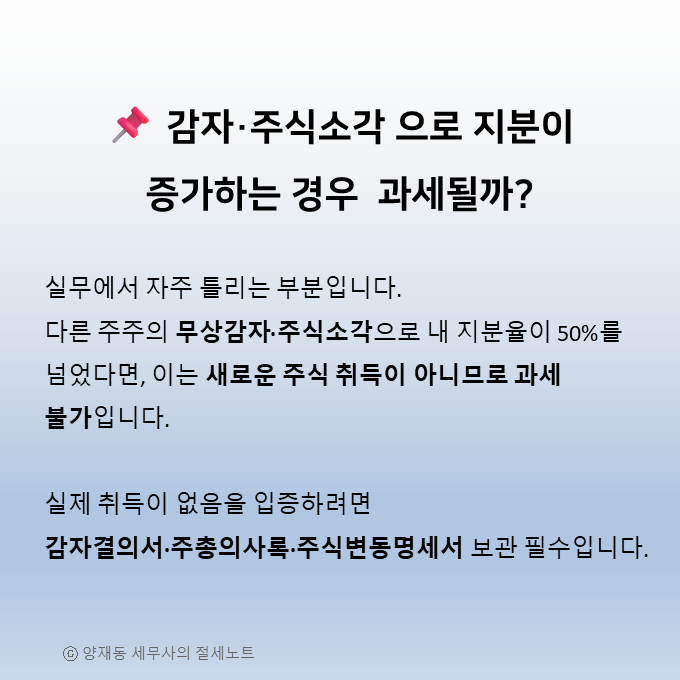 💬 실무 코멘트: 감자·소각 후 지분율이 50%를 넘는 사례는 신고 누락이 가장 자주 발생하는 유형입니다.