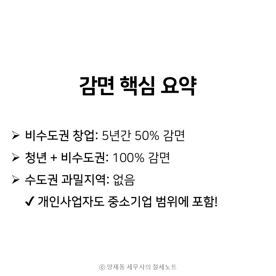 - 수도권 과밀억제권역 외 지역 창업: 5년간 50% 감면
