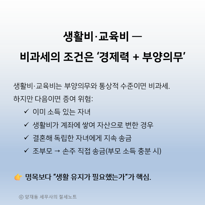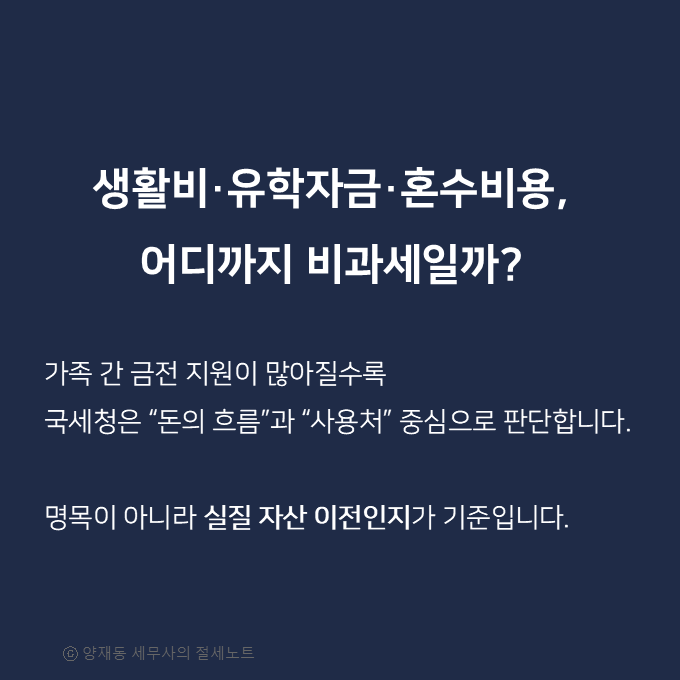 생활비나 유학경비처럼 일상적인 지원이라도 조건을 벗어나면 증여세 과세대상이 되고, 사용 목적이 명확하지 않거나 잔액이 남아 있으면 향후 세무조사에서 문제될 수 있습니다.
