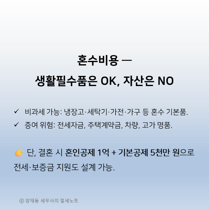 4️⃣ 혼수비용 지원 ― “생활필수품 vs 자산형 재산”의 구분