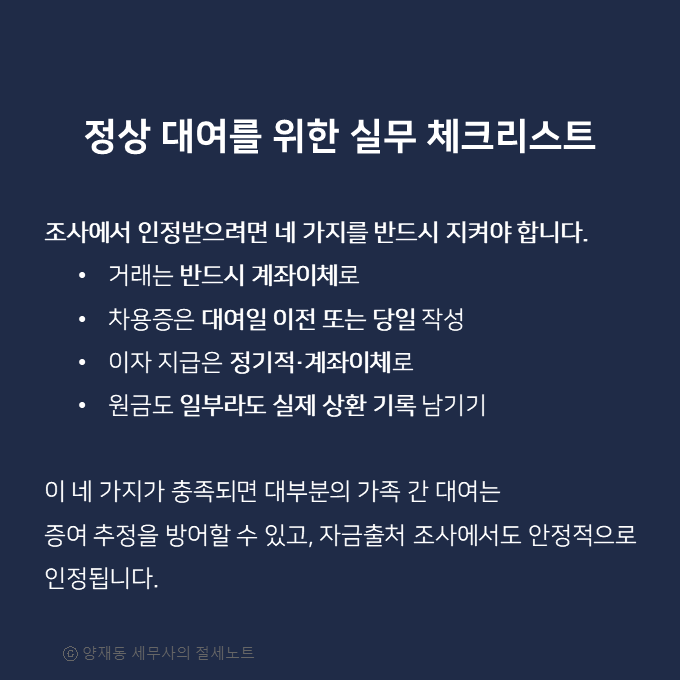 이 네 가지만 충족해도 가족 간 대여에 대한 증여 의심은 대부분 방어할 수 있습니다.