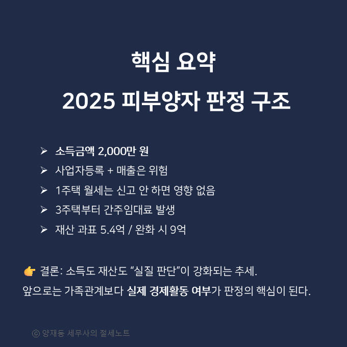 2025년 현재 기준으로는 소득·재산·부양관계 요건을 모두 충족해야만 피부양자로 유지됩니다.