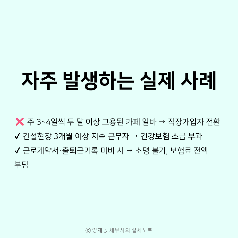 특히 2개월 이상 반복 근무가 이어지면 일용직 인정 여부가 흔들리기 시작하므로, 이 시점만 잘 관리해도 소급 부과의 위험을 상당 부분 줄일 수 있습니다.
