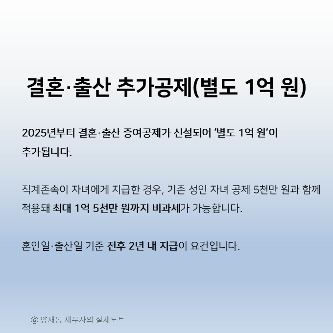 3️⃣ 결혼·출산 증여공제 ― 기본공제와 별도로 최대 1억 원 추가 공제