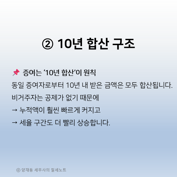 비거주자의 경우에는 공제 자체가 인정되지 않기 때문에, 같은 10년 합산 구조라 하더라도 세 부담이 훨씬 가파르게 증가합니다.