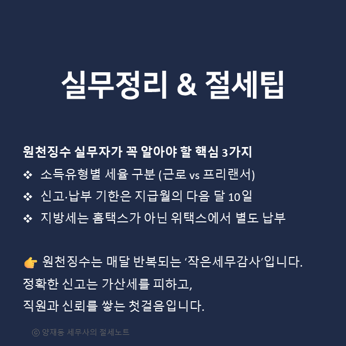 이 세 가지를 꾸준히 이행하면 원천징수 업무는 완성됩니다.