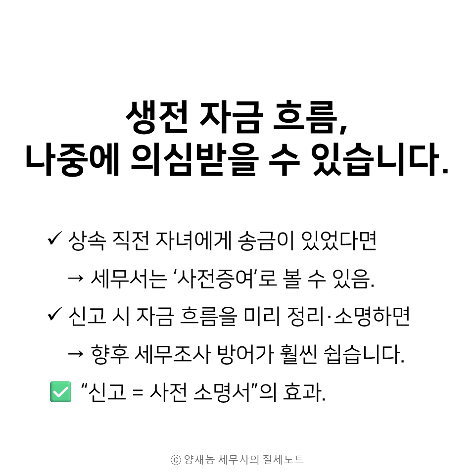 → 피상속인의 생전 자금 흐름을 ‘공식적으로 정리’할 마지막 기회입니다