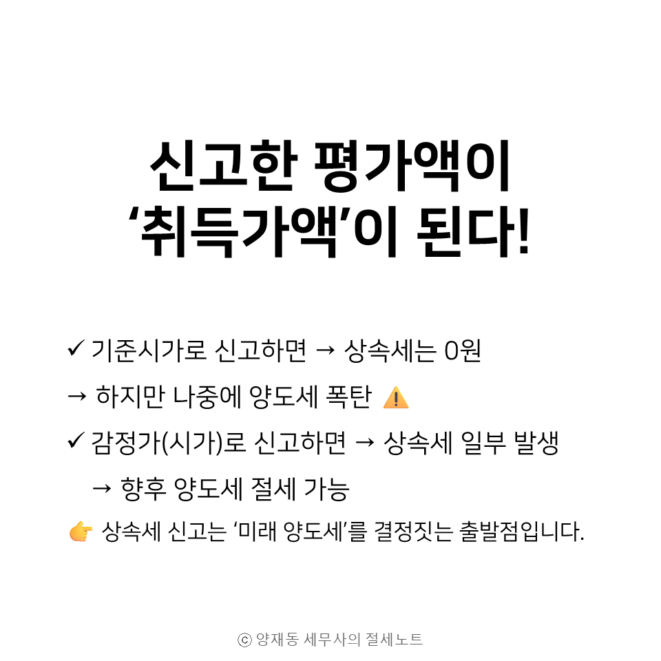 즉, 상속세가 0원이더라도 감정평가를 활용해 취득가액을 높여두면, 훗날 부동산을 매각할 때 절세 효과가 매우 큽니다.