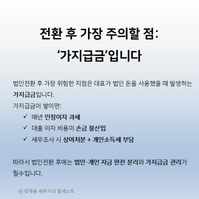 4️⃣ 법인전환 후 가장 위험한 지점 – 가지급금