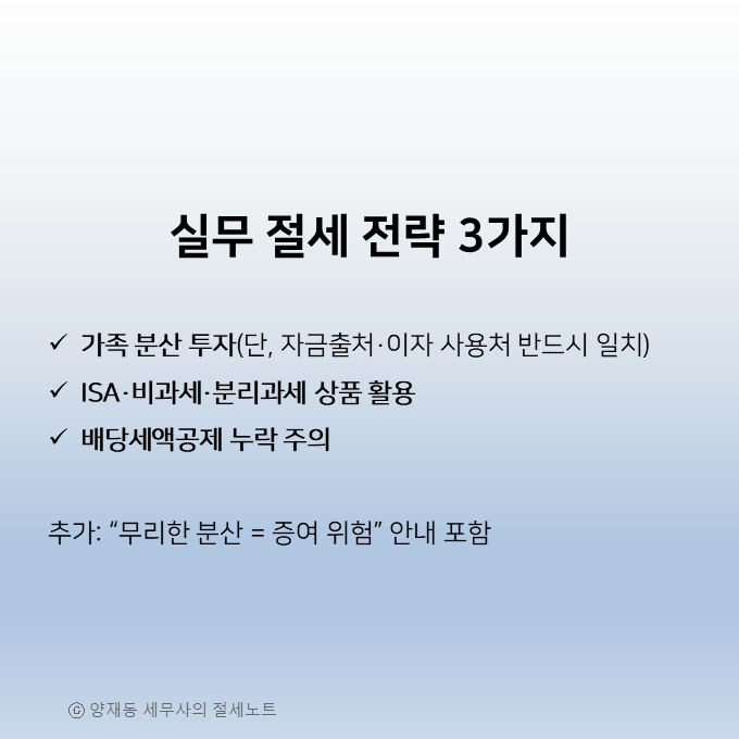 - 절세는 가족 분산·ISA·비과세상품·배당세액공제로 설계 가능